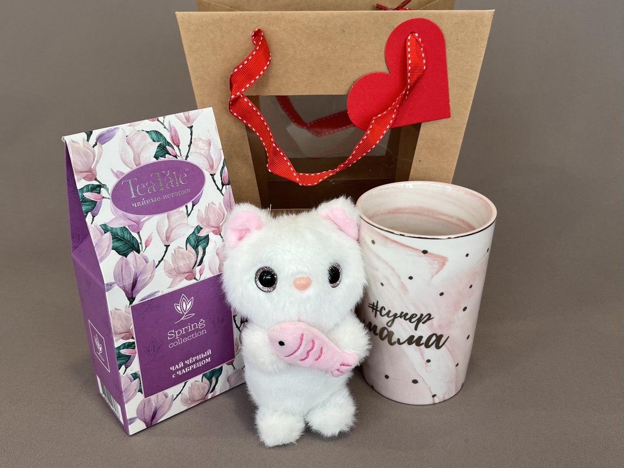 Милый набор для самого близкого человека на свете - Мамы. В наборе кружка керамическая объемом 350мл, чай черный листовой в подарочной упаковке 50г, игрушка-брелок "Котик", подарочный пакет для красивой подачи подарка.