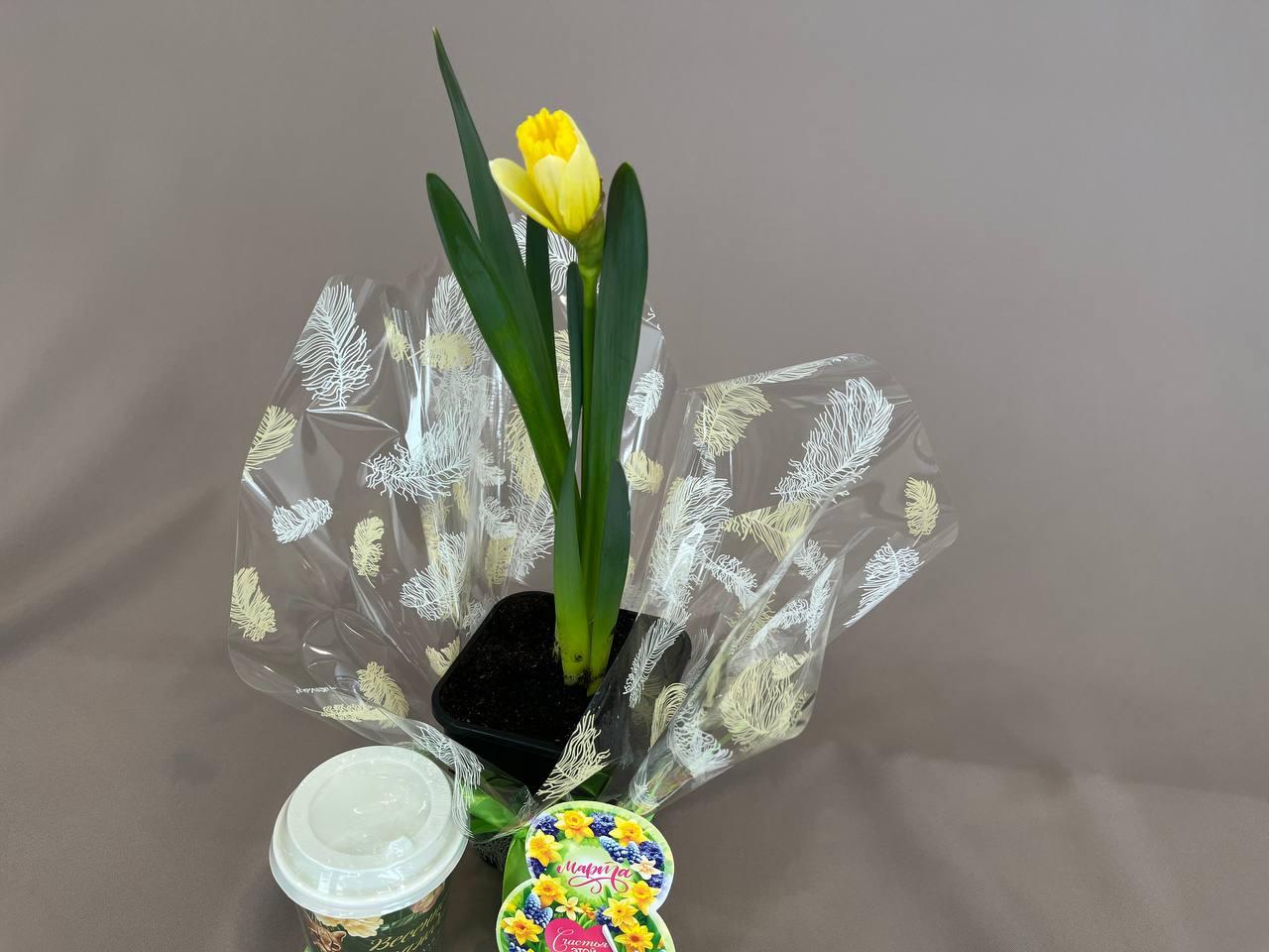 Нарцисс в горшочке, открытка с тематикой 8 марта, бомбочки для ванны 6*20г Сочное яблоко.